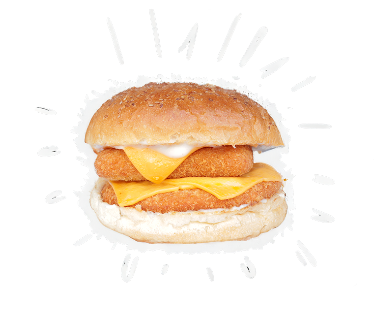 Hamburger ekmeği, 120 g tavuk şnitzel, 45 g kaşar pane, cheddar peyniri ve lab spesiyal sos ile